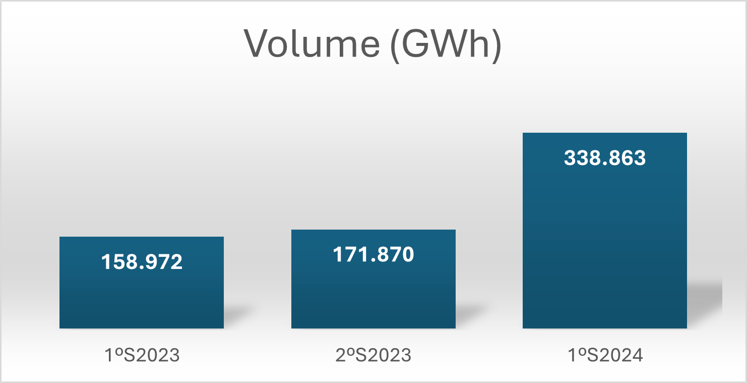 Em volume energético a soma é de 338,9 mil GWh, alta de 113,2% em comparação com o mesmo período do ano passado e 97,2% com o semestre anterior. Trata-se de recorde não só semestral como anual, pois supera todo o acumulado de 2023. Esse montante foi distribuído em mais de 50 mil operações, alta de 431,4% em relação ao 1S2023 e 254,3% comparado com o 2S2023.